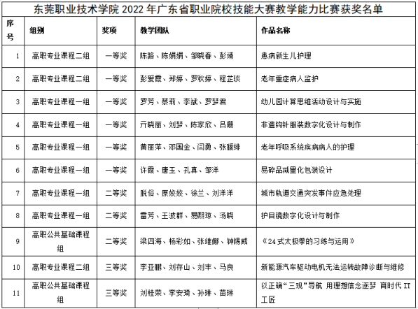 近日,2022年广东省职业院校技能大赛教学能力比赛落下帷幕,我校11支教学团队分别在公共基础课程组、专业课程一组、专业课程二组获得一等奖6项,二等奖3项,三等奖2项,获奖总数位居全省高职院校第三。其中,老年重症病人监护、易碎品减量化包装设计、老年呼吸系统疾病病人的护理等3支团队进入本次国赛遴选。