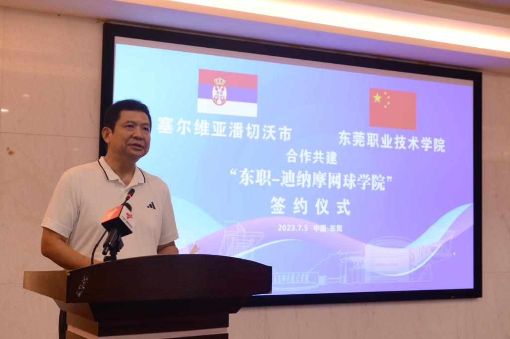 党委书记朱益民表示,本次签约仪式是第3届中国高职院校网球锦标赛暨第7届中国高职院校“校长杯”网球比赛的重要活动,也是我校国际合作交流的一件盛事,我校经过多年努力,先后与德、澳、英、加等20多个国家及港澳台地区的30多所高校或机构建立了密切的合作关系,在互学互鉴、共建共享中推动了学校高质量发展,也为“一带一路”倡议作出了东职应有的贡献。他指出,通过这次签约仪式,能够深化学校与塞尔维亚潘切沃市在教育、体育和人才等领域的合作交流,发挥两地资源优势共同培养高水平体育人才,将“东职-迪纳摩网球学院”建成中国高职院校网球教育的一面旗帜,助力东莞与潘切沃市友好城市建设,服务东莞“体育强市”发展。