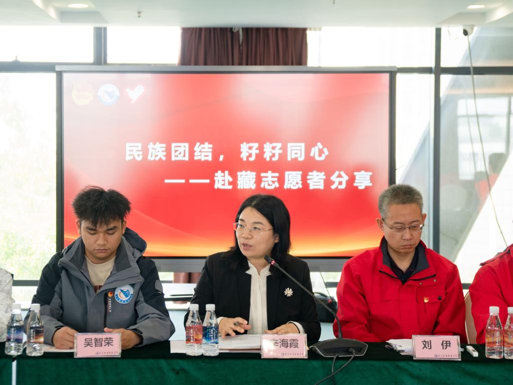 座谈会上,赴藏师生代表分享了他们在西藏林芝巴宜区支教与实践的心路历程。辛海霞老师和杨钦萍同学代表在林芝巴宜区幼儿园服务了4个月的学前教育专业志愿者分享了他们面对自然环境、文化差异等的巨大挑战,积极发挥专业优势,因地制宜,主动成长,为当地孩子制定教学计划、开展课外活动、推广普通话、传播南粤文化。刘伊老师和张晓雨、金世炫等同学从青马学员红色研学、“科学教育+文化莞宜”主题成长营课程设置与教具开发、成长体会等方面分享了“莞宜石榴籽”青马学员民族团结实践团的生动实践,用行动和真情书写了东职青年在实践中成长,在奉献中铸魂的青春故事。