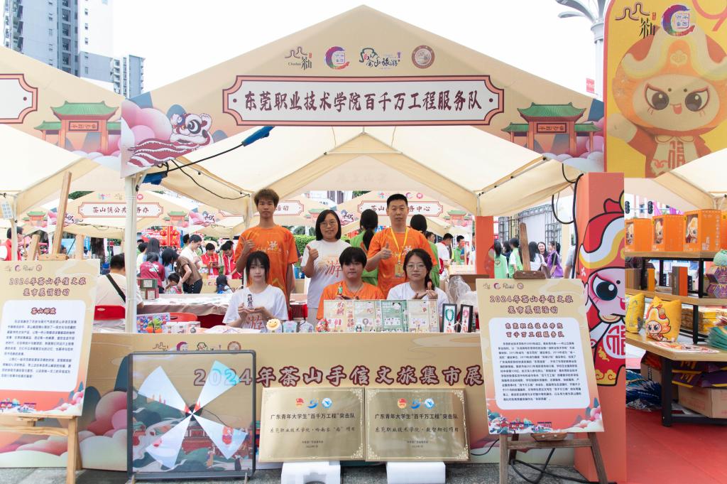此外,在茶山手信文旅集市展销会上,我校“百千万工程”茶园游会创意设计志愿服务队为茶山镇量身打造的文创精品也精彩亮相,其中融合了茶山东岳庙牌坊造型元素的文化衫、基于茶山公仔进行系列创新设计的公仔“迎迎”等颇受观众喜爱。