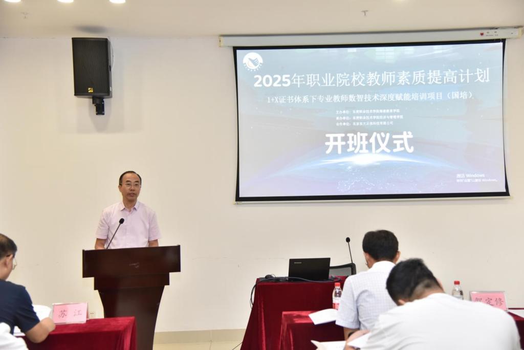 7月7日, “2025年职业院校教师素质提高计划——1+X证书体系下专业教师数智技术深度赋能培训项目”开班仪式在我校培训楼隆重举行。学校党委副书记、校长贺定修,正保网中网副总裁田久学,继续教育学院院长苏江,经济与管理学院党总支书记陈柏林、经济与管理学院副院长张文利等领导出席了开班仪式。开班仪式由继续教育学院院长苏江主持。